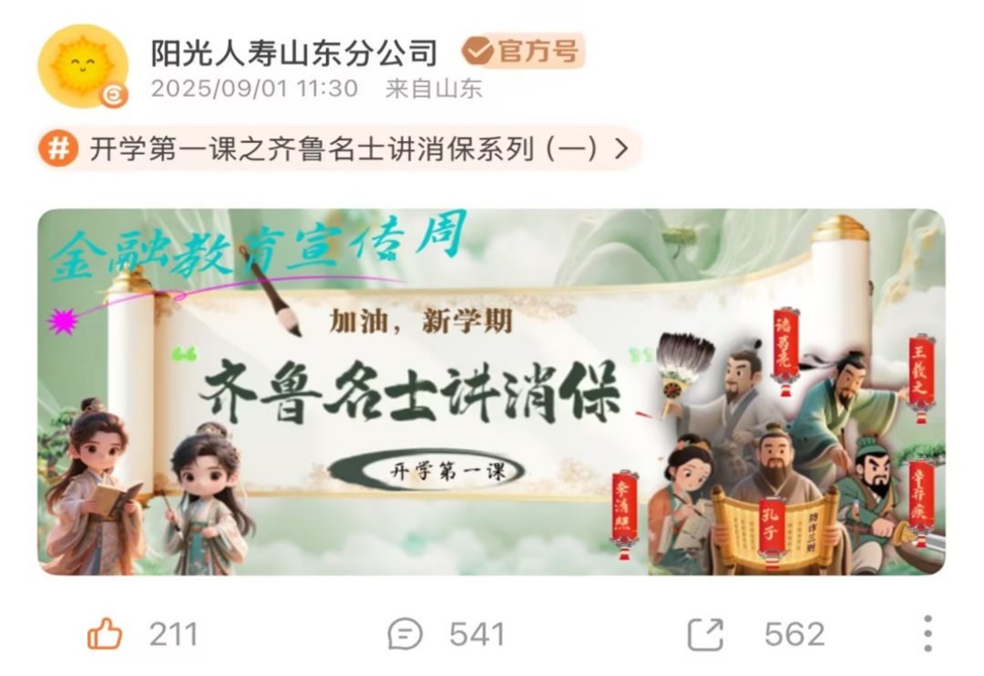 当开学季临近金融教育宣传周,阳光人寿山东分公司在线上特别策划推出“开讲啦·齐鲁名人讲消保”系列,孔子、李清照、辛弃疾、诸葛亮、王羲之五大齐鲁历史名人天团“穿越”时空,化身“金融守护神”,用千年前的智慧为现代金融消费安全“站台”。